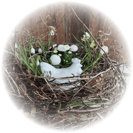 Aus Ästen und Ranken schlingst und windest du ein grosses Nest ca. 50 cm. Du wirst es frühlingshaft bepflanzen und mit dem selber gegossenen Betonhuhn/ Vogel ergänzen.