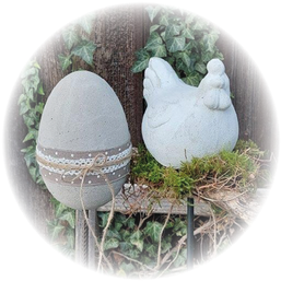 Du modellierst 1 grosses Osterei aus Beton, werkelst mit Naturmaterialien ein Nest/Kranz und dekorierst dieses nach deinem Geschmack. Ein richtiger Hingucker für die Osterzeit.